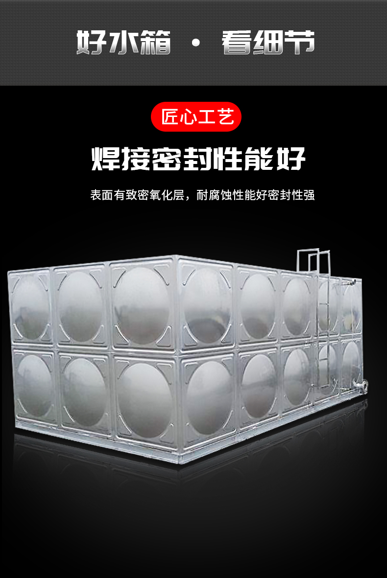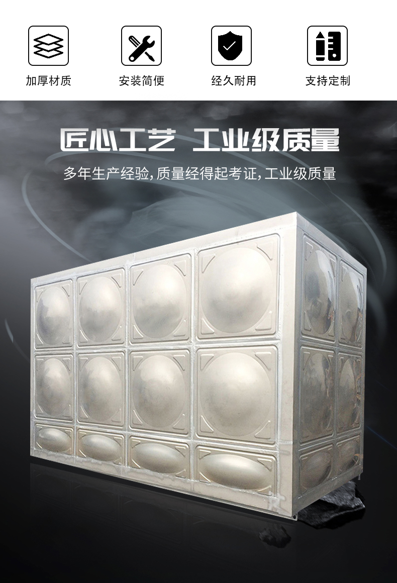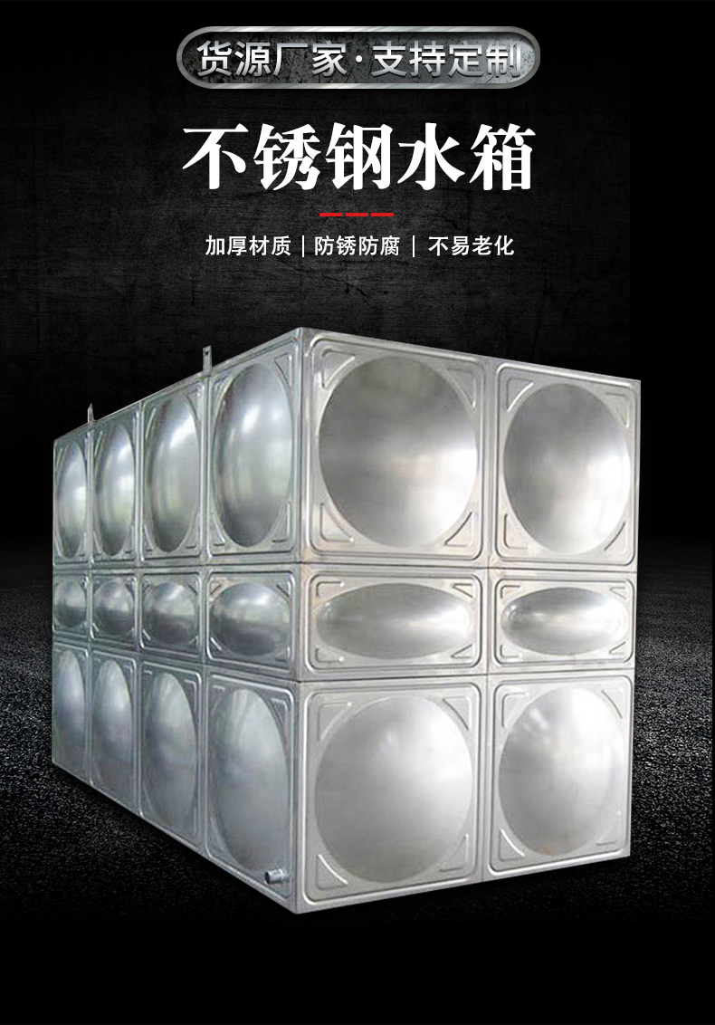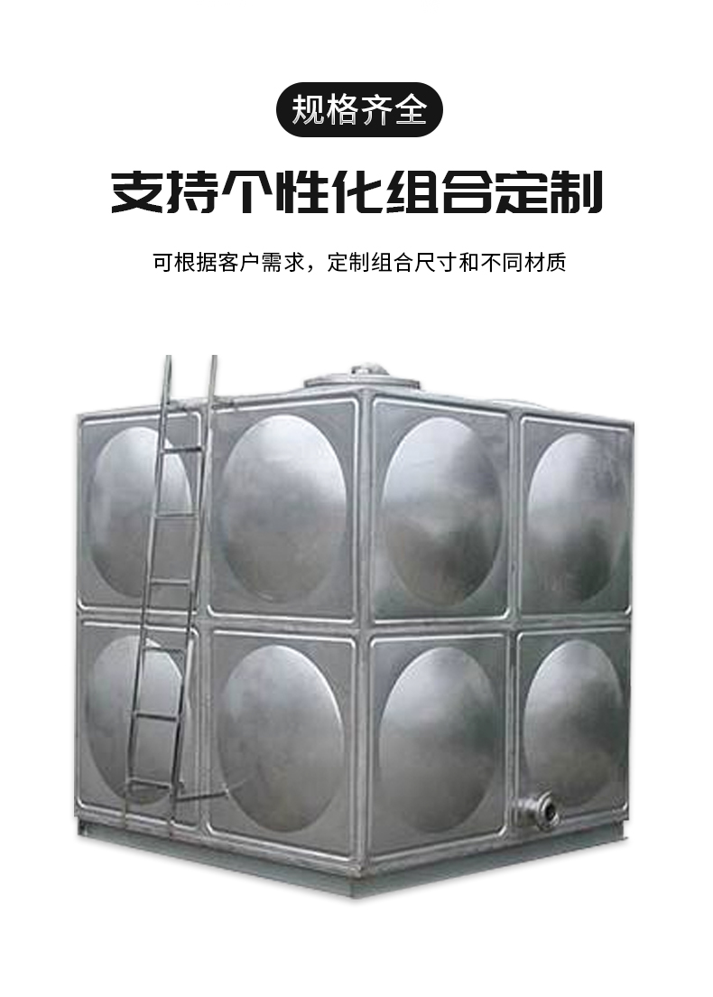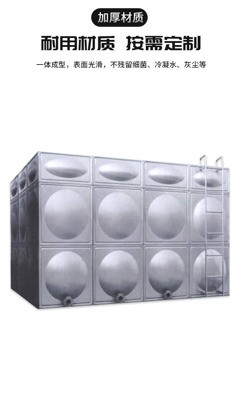 1、不銹鋼水箱一般采用SUS304材質的不銹鋼板材,物理化學性質穩定,對水質無污染,保證水質清潔衛生;